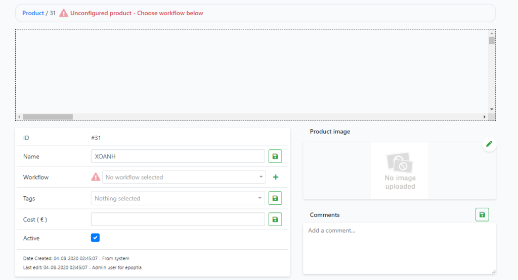 Ροή Εργασίας: Εισάγετε Ροή εργασίας για το συγκεκριμένο προϊόν. Αυτό γίνεται είτε επιλέγοντας κάποιο Υπόδειγμα Ροής, είτε φτιάχνοντας συγκεκριμένη ροή για το συγκεκριμένο προϊόν.