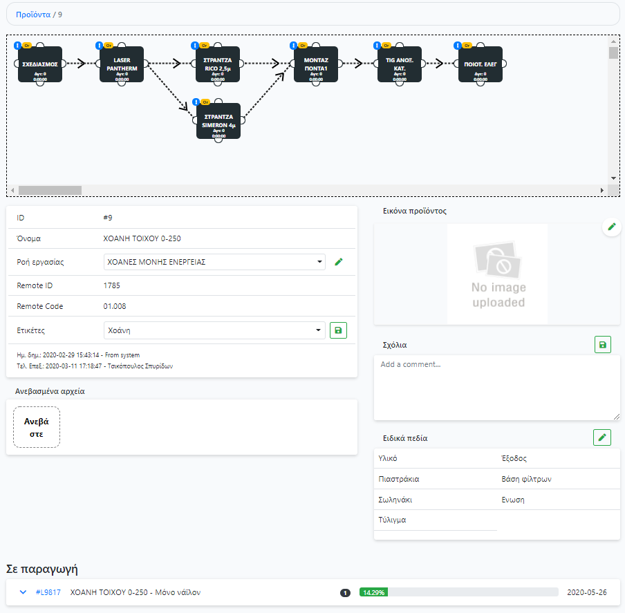 Επιπλέον στο κάτω μέρος ύπαρχει μια λίστα με τις εντολές γραμμών παραγωγής που έχουν αυτο το προϊόν.