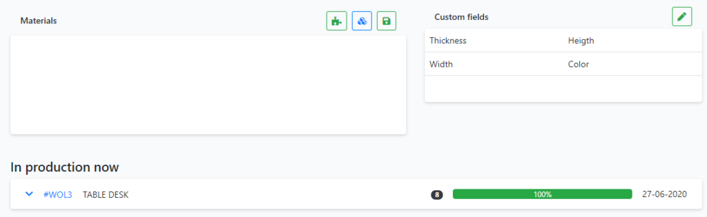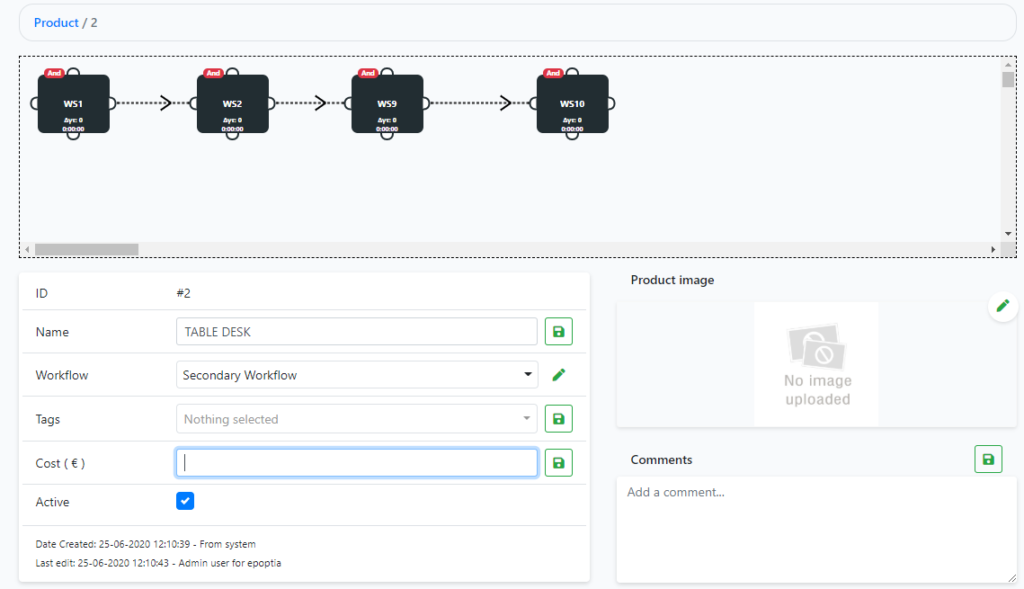 Η οθόνη Επεξεργασίας Προϊόντος εμφανίζεται, πατώντας στην ονομασία του προϊόντος όπου μπορείτε να αλλάξετε τα στοιχεία, τις προδιαγραφές, τα σχέδια, τις ετικέτες, ειδικά πεδία, υλικά και τη ροή που ακολουθεί το προϊόν. Δείτε περισσότερα στην ενότητα “Εισαγωγή Νέου Προϊόντος” και στην “Δημιουργία & Ρύθμιση Ροών Εργασίας”.