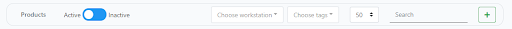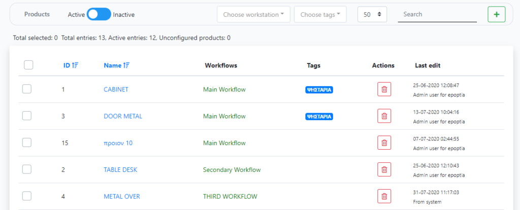 Στα προϊόντα , όταν επιλέγετε το Active βλέπετε τα προϊόντα που είναι ενεργά και είναι ορατά στη παραγωγή. Επιλέγοντας το Ιnactive βλέπετε τα προϊόντα τα οποία δεν είναι ενεργά και δεν εμφανίζονται στη παραγωγή. Τα προϊόντα όταν απενεργοποιούνται δεν διαγράφονται. Διαγραφή ενός προϊόντος γίνεται επιλέγοντας το κουμπί διαγραφής που βρίσκεται δίπλα από το κάθε προϊόν.