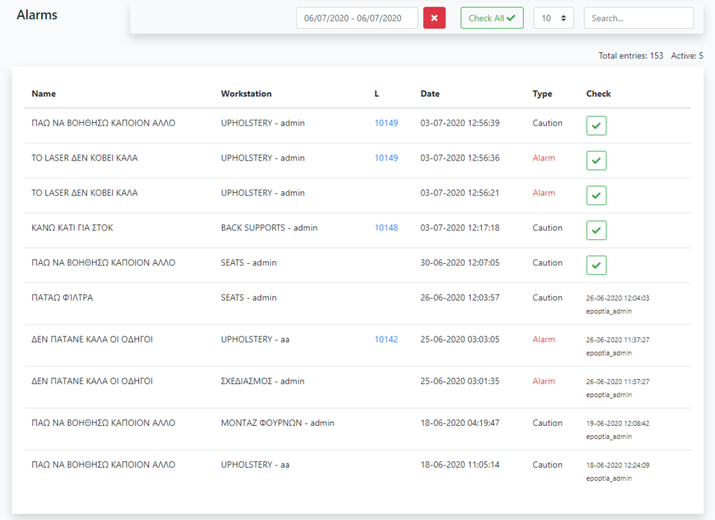 Στη συγκεκριμένη οθόνη, βλέπετε όλους τους συναγερμούς που έχουν ενεργοποιηθεί από τους εργαζομένους σε μορφή λίστας.