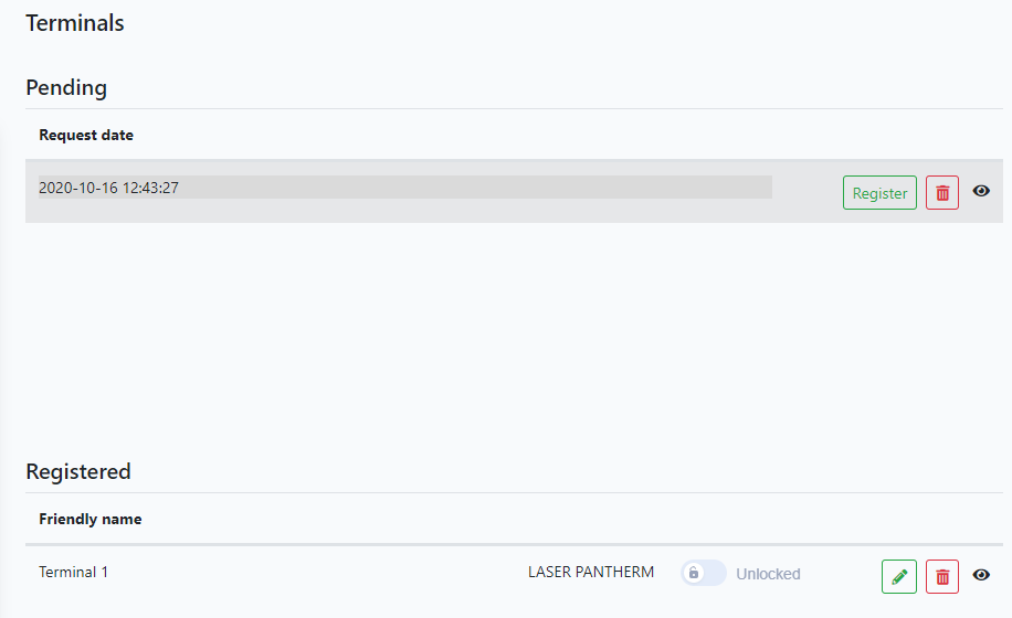Στην στήλη Pending εμφανίζονται οι νέες αιτήσεις που αναμένουν για αποδοχή, ενώ στην στήλη Registered τα terminals που έχουν ήδη καθοριστεί.