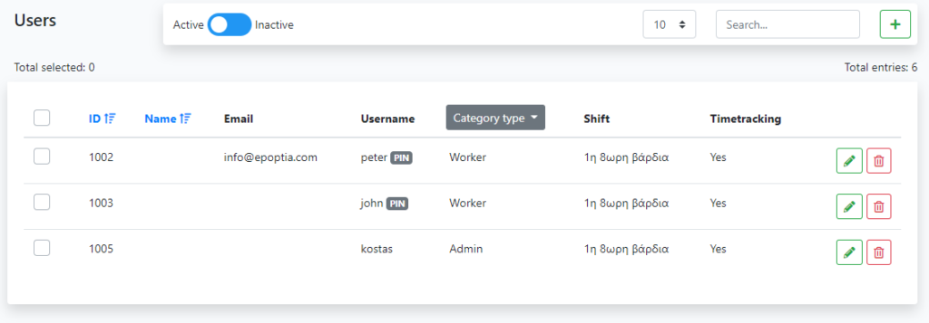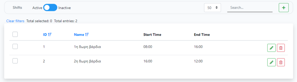 Στο πεδίο Αctive βλέπετε τις Ενεργές Βάρδιες και στο πεδίο Inactive βλέπετε τις ανενεργές Βάρδιες.