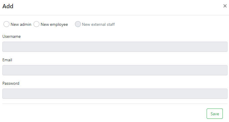 και εμφανίζεται το πεδίο, όπου επιλέγετε αν είναι νέος διαχειριστής ή εργαζόμενος, συμπληρώνετε το όνομα του Χρήστη, το email και το κωδικό και πατάτε αποθήκευση.