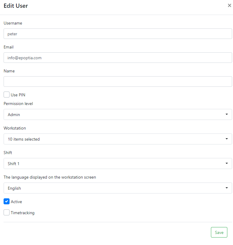 .Σας εμφανίζεται η καρτέλα του επιλεγμένου Χρήστη για να κάνετε τυχόν αλλαγές ή ρυθμίσεις στο επίπεδο Δικαιωμάτων των Χρηστών, τις Βάρδιες, τα στάδια της παραγωγής που έχει πρόσβαση ο Χρήστης, το επίπεδο εξουσιοδότησης, τη γλώσσα εμφάνισης στο σταθμό εργασίας, αν είναι ενεργός και η καταγραφή του χρόνου.